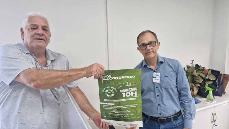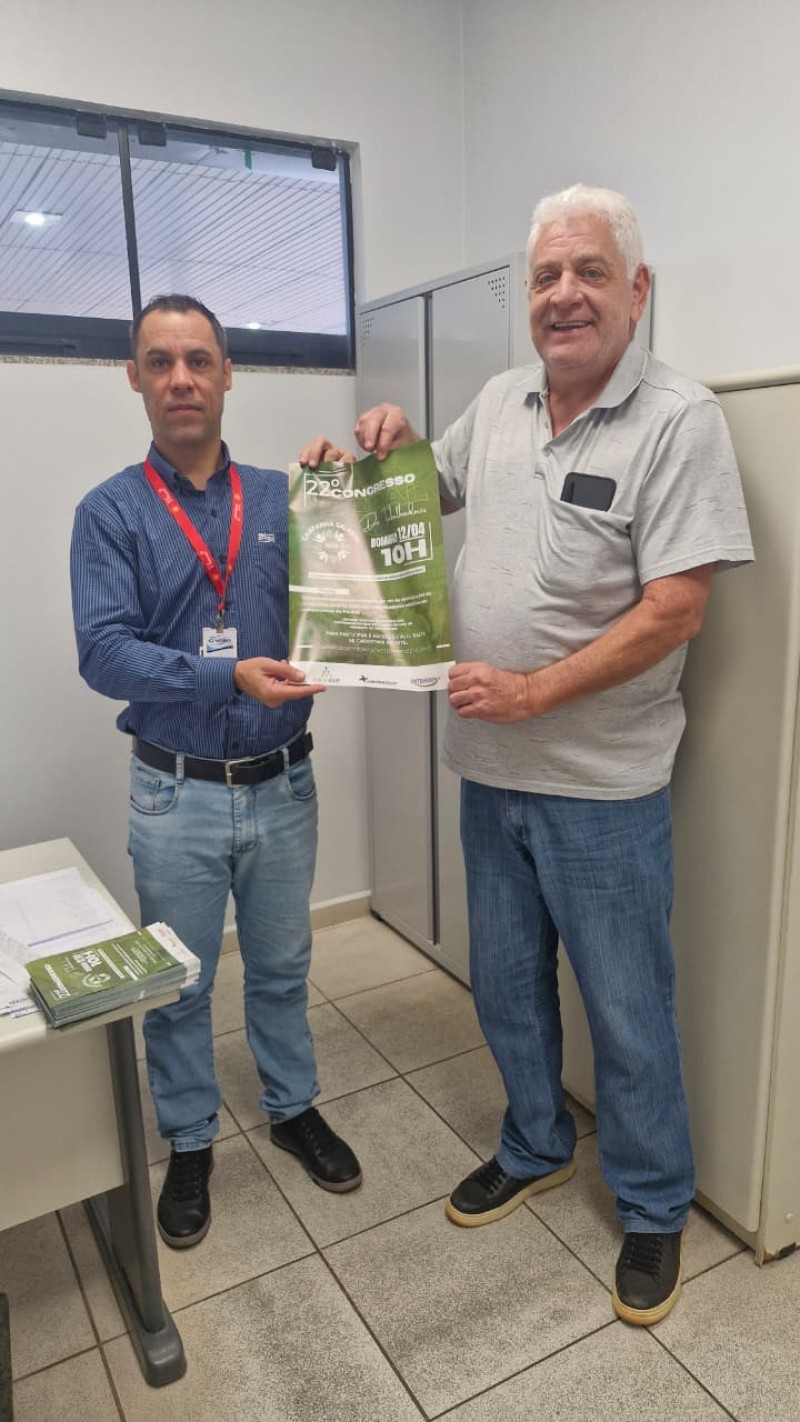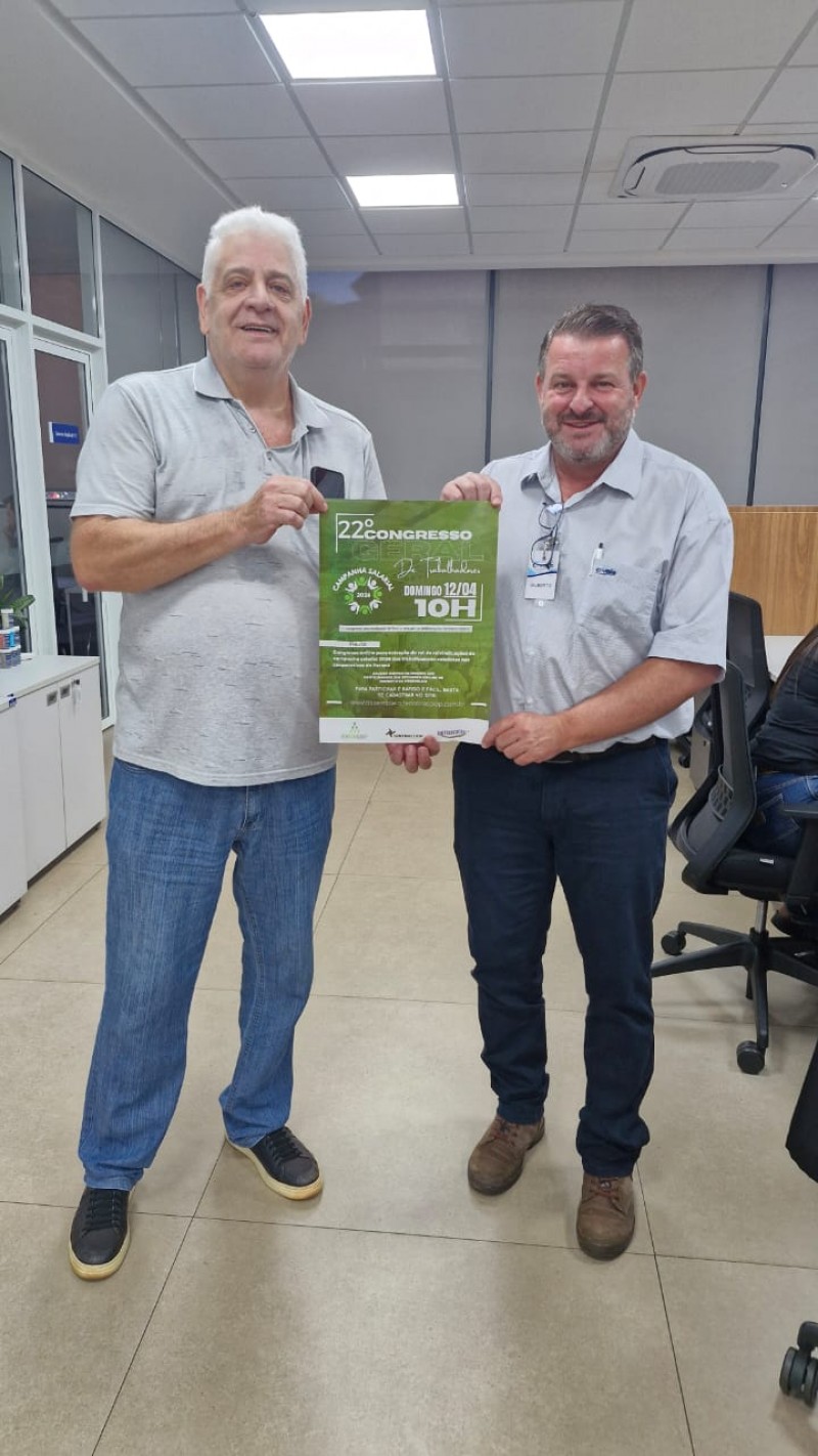 Na tarde da última segunda-feira (30), o advogado Dr. Ivânio Baldicera e o assessor de imprensa do Sindicato Sintrascoopa, Marcelo Silva, realizaram visitas às unidades da cooperativa C.Vale nos municípios de Guaíra e Terra Roxa, além dos distritos de Santa Rita, São José e São Camilo. O objetivo foi mobilizar e convidar os trabalhadores para participarem do 22º Congresso da categoria que será realizado no dia 12 de abril, a partir das 10h, em formato virtual, com deliberações digitais.